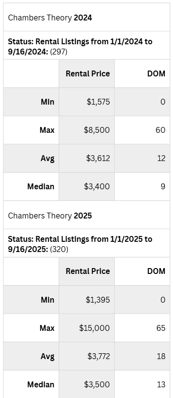 - Slower Lease up timelines: Delayed repairs in occupancy turnovers and “Make Ready” home marketing improvements could lean on additional listing days on market and possibly increase vacancy days too. Looking at the data below, you’ll see Chambers Theory rental listing statistics from the January 1 to September 16 calendar-period for 2024 compared with the same-period rental listing data of 2025. While Chambers Theory has found a higher average rent in 2025 (+$160/month higher average) it has also taken an additional 6 days, on average, to procure a lease in 2025 when compared with 2024.